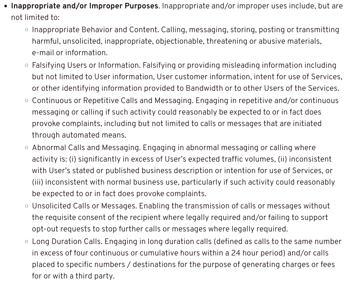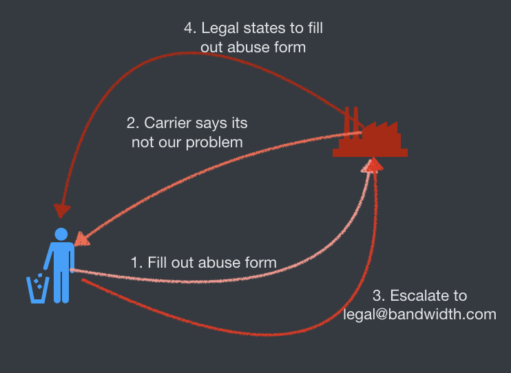 Bandwidth.com will not disclose the sub-carrier or service, thus blocking any attempts at me resolving at the carrier level. Further, they push acceptable use entirely to their undisclosed customer.