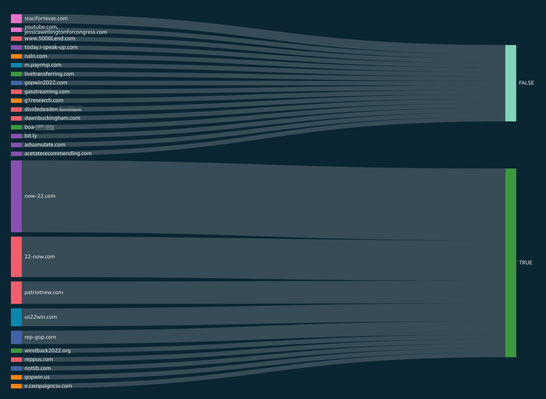 True: Domain fronts for winredFalse: Domain does not front for winred- Text messages without domains have been filtered out