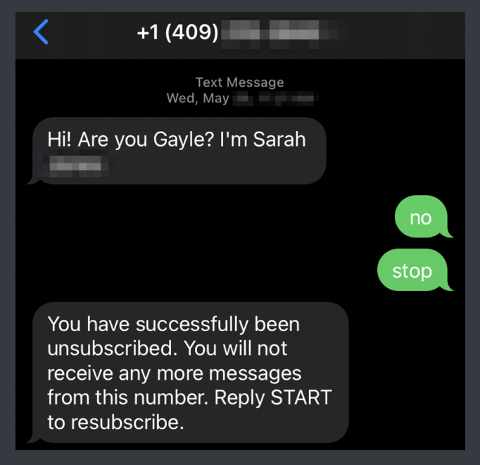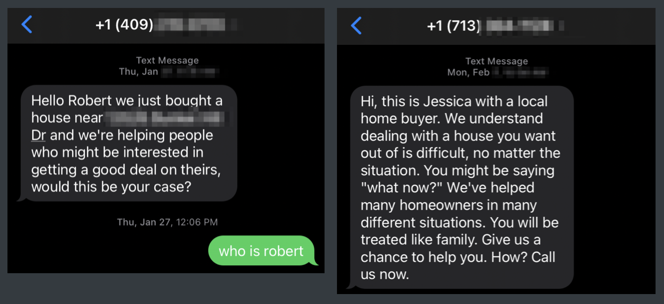 For 2+ years, I have been receiving large numbers of voice calls and some text messages with cash offers to buy someone named Stan’s house. These calls and texts occur at inconvenient hours for me, something I attribute to having a phone number that is not related to the timezone that I live or work in.